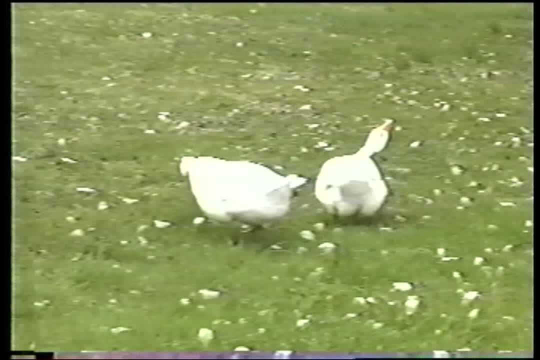 2 white geese attack groomsmen by pond at wedding reception. Chase, bite at feet, knock them over. Goose, duck. Man's fall partially hidden by tree. Best man.