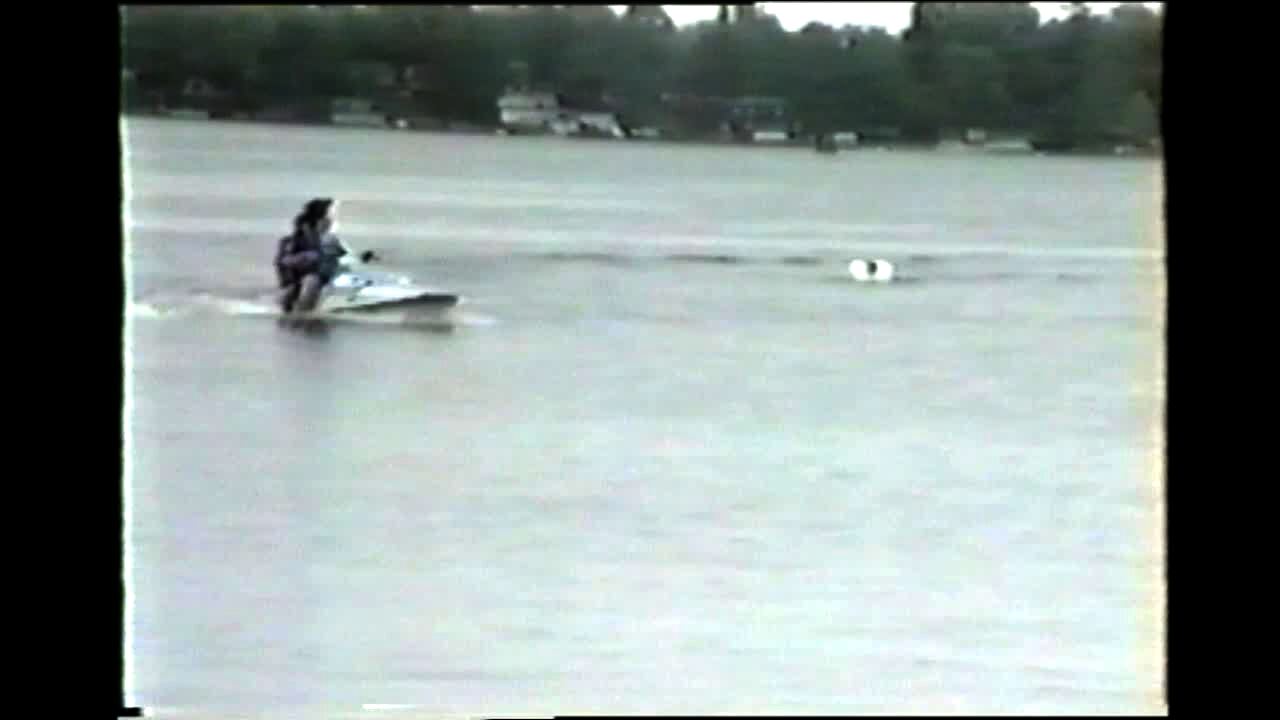 Man is fishing from a kayak. Duck / goose jumps up onto man's back and attacks him, flaps its wings. Man & kayak tip over. Camera is mounted in back of boat.