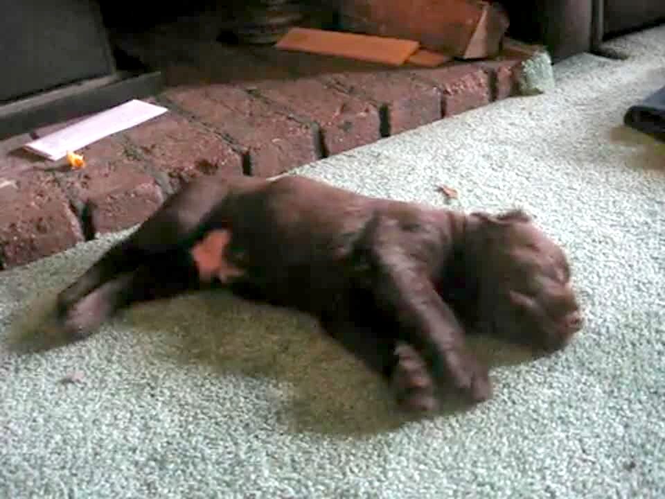 Brown puppy dog sleeps on the floor and moves / kicks his legs while dreaming.