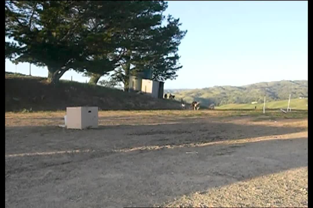 POV shot of man calling group of fifteen dogs to him in field, dogs stampeding over man. He falls down, camera goes all askew.