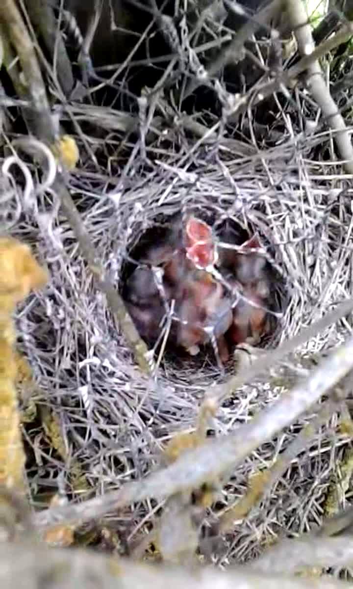 A man finds a bird's nest of baby birds in a bush and each time he sings, the baby birds hold their heads up with their beaks open.