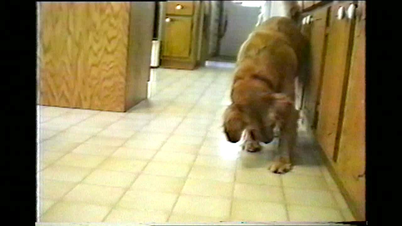 A tot girl stands on a trampoline while a dog walks around and barks underneath. Her older cousin then shouts "you're ruining a family moment!"