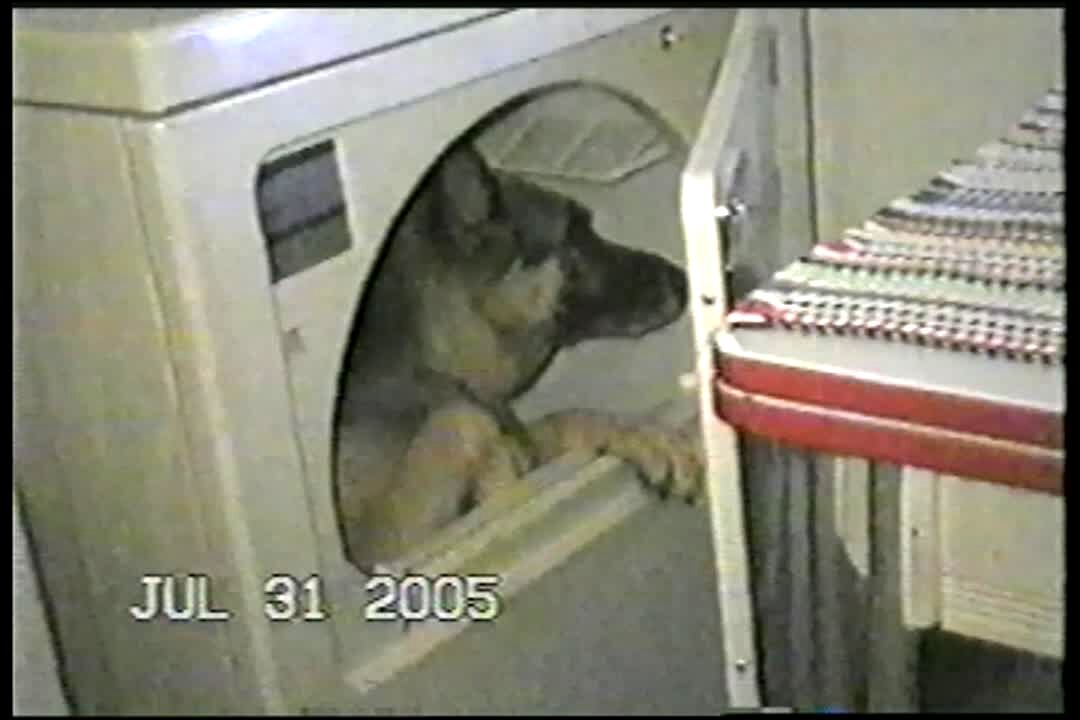 German Shepherd dog climbs into clothes dryer & won't come out. Finally comes out after owner begs. Silly pet trick.