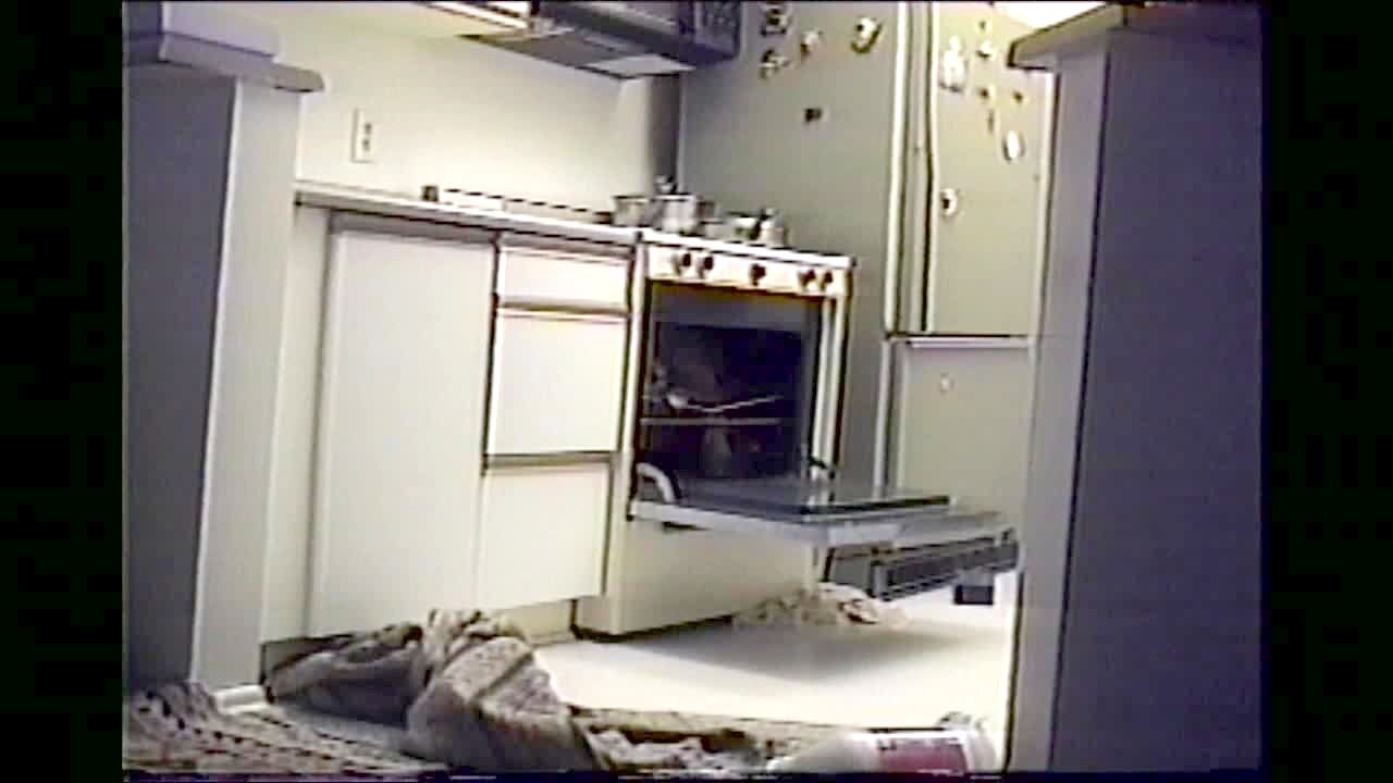 Woman gets stuck in dishwasher (Runner). Date on screen 1986.