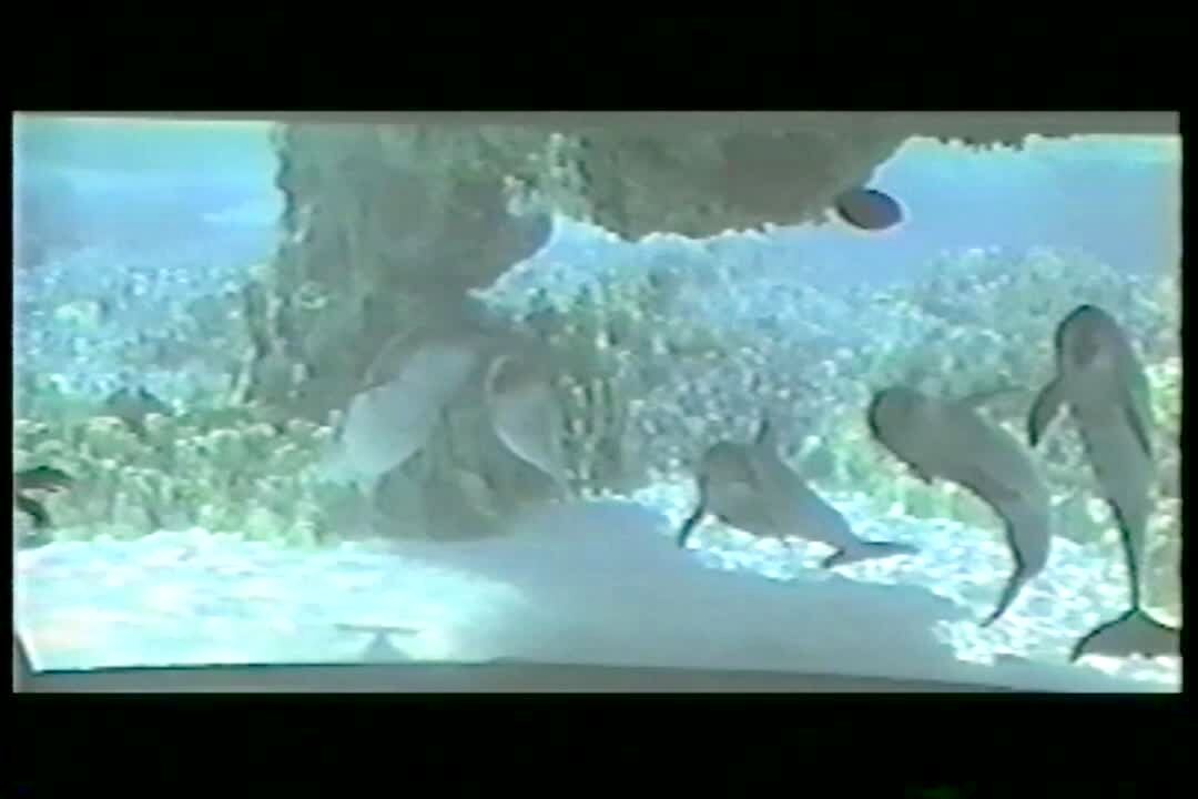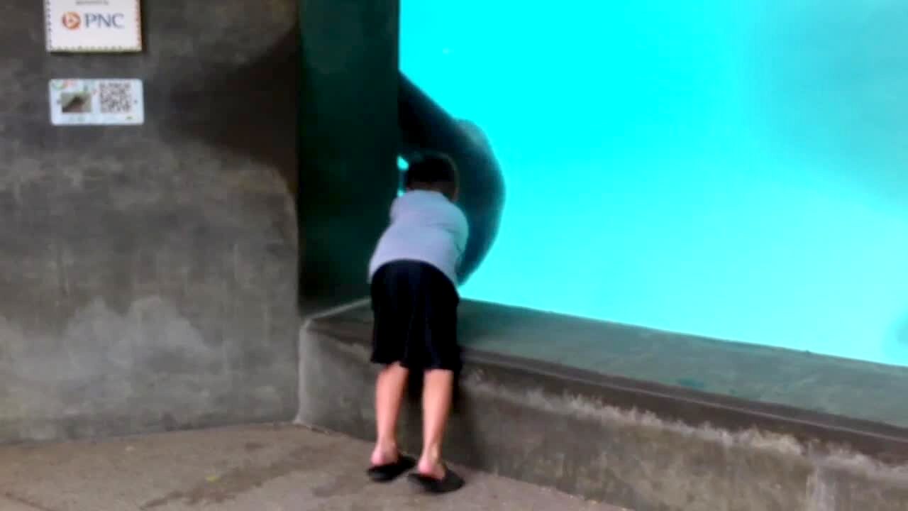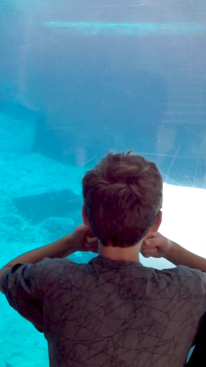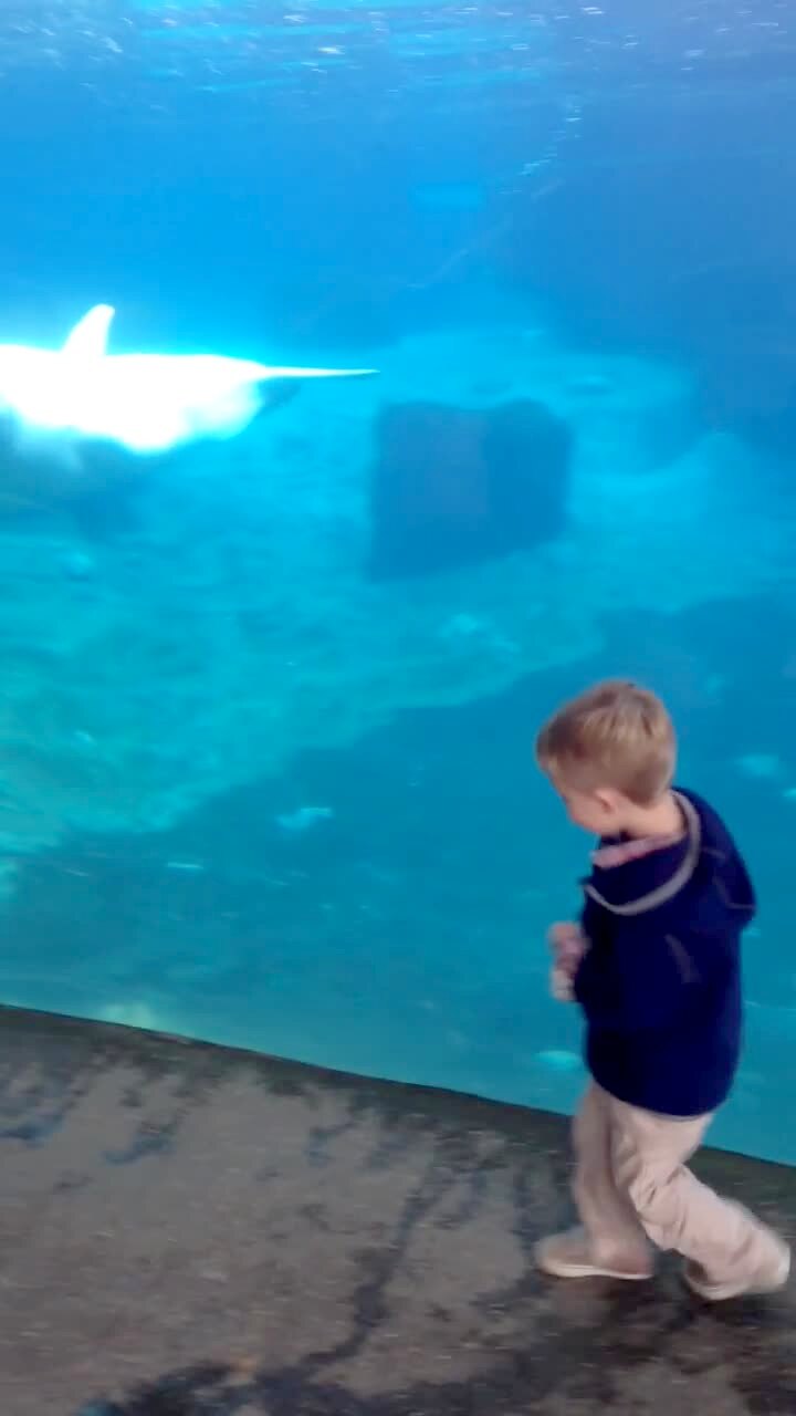 A tot boy backs up and falls down when he sees a giant whale behind the glass open its mouth at the aquarium. Short tail.