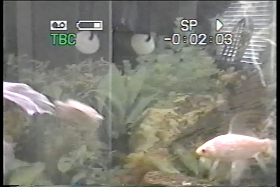 Small turtle in a big fish tank bites a fish's tail and doesn't let go. Turtle gets pulled throughout the aquarium.