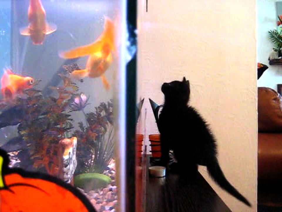 Black kitten tries to swat at an aquarium & falls off of a cabinet. No recovery, no tails, very short. Cat knocks over an un-lit candle. Fish tank.