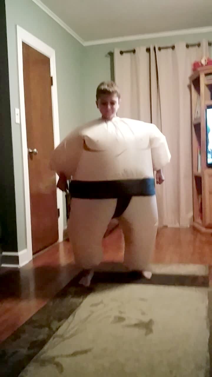A man dances along to a song and falls backwards into a dining chair in a living room. Music rights not cleared.