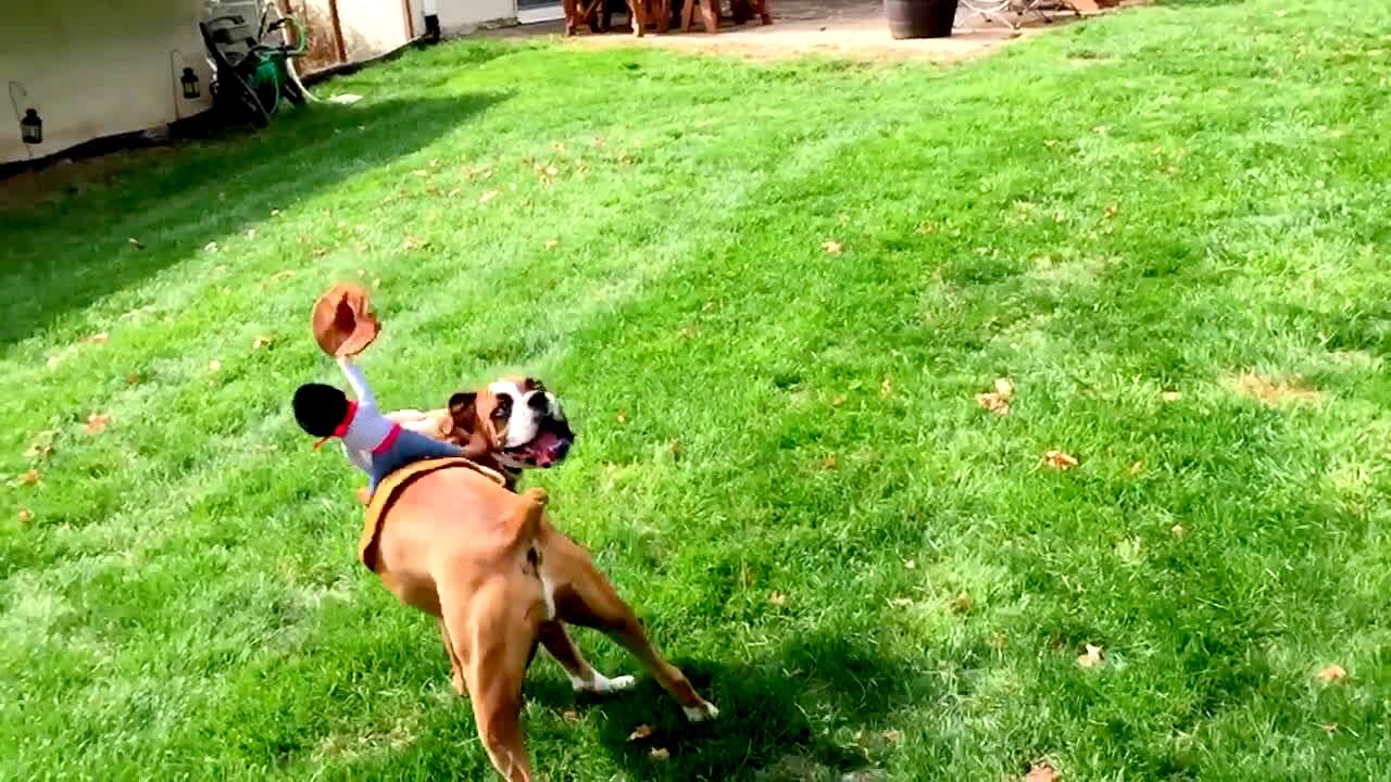 A dog jumps to catch a toy in slow motion but gets hit in the face with it.