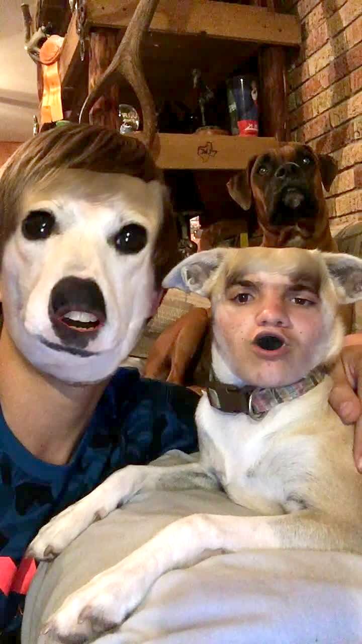 A teen boy and a dog do a face swap in the living room and the boy introduces himself as a dog. AA: face swaps