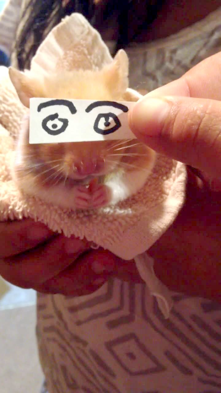 A hamster with hand drawn paper eyes over its face indoors. AA: Make some paper peepers.