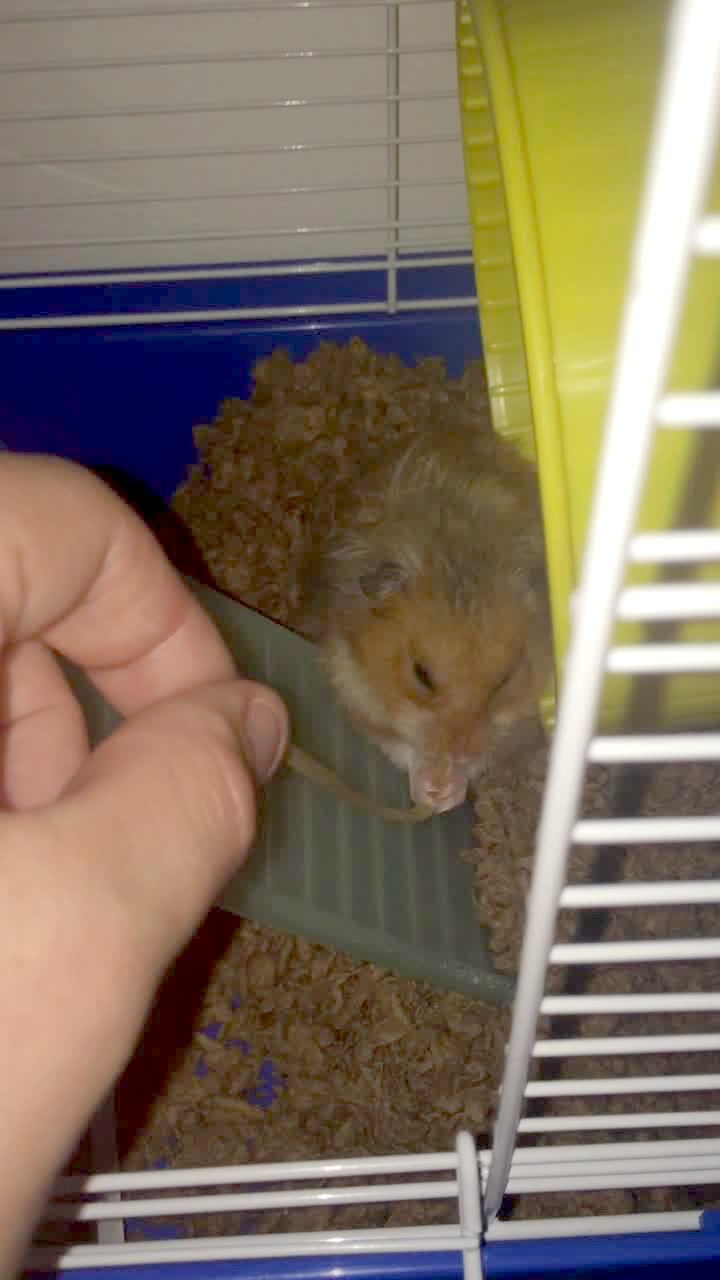 A man feeds a string of spaghetti to a hamster in its cage in the living room.