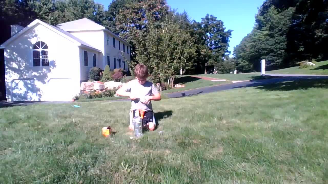 A young boy makes a bottle rocket and then turns it upside down and it launches into his face.