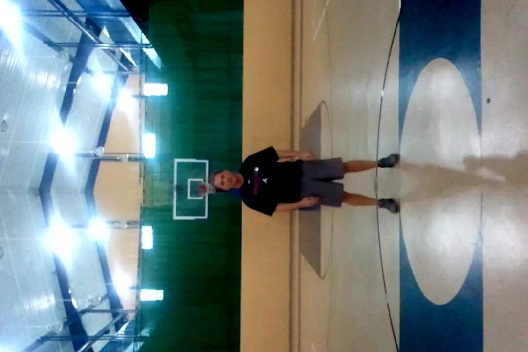 A teen boy throws a basketball off of the top of the stands in a sports stadium outdoors and into a basketball hoop.