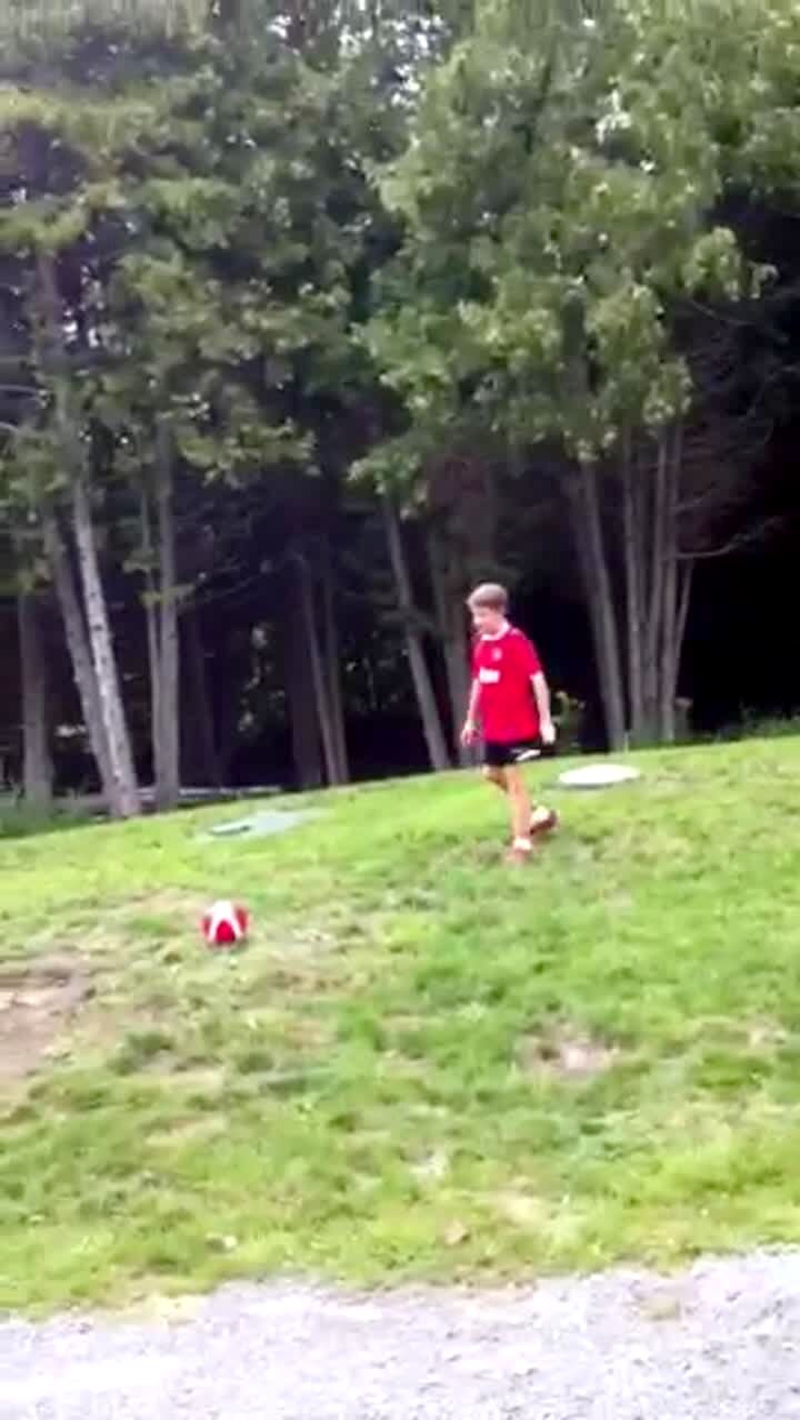 A boy kicks a soccer ball into a basketball hoop from across a street outdoors. Trick shot.