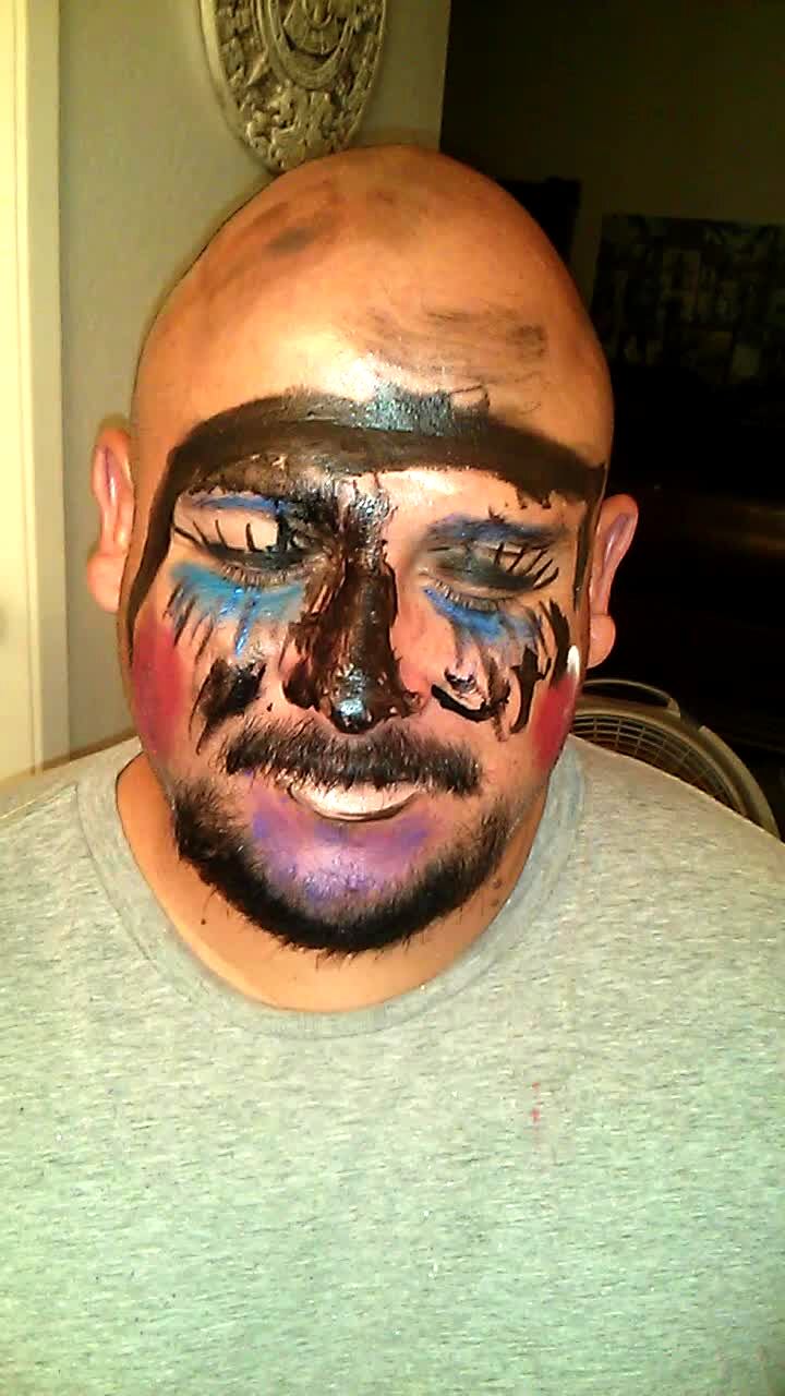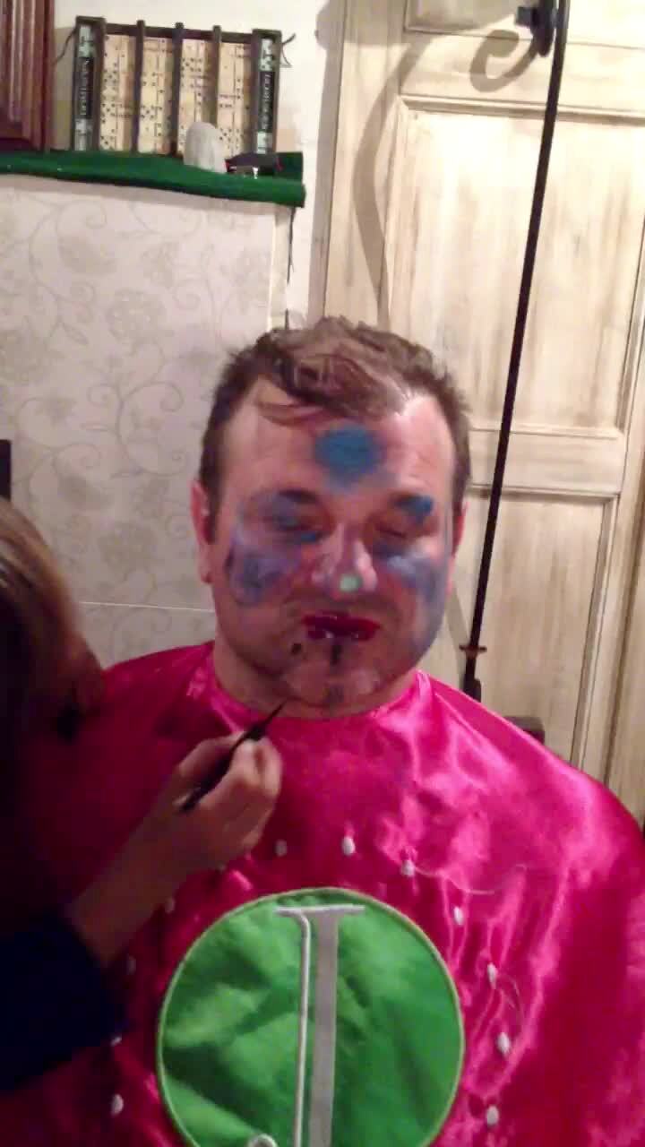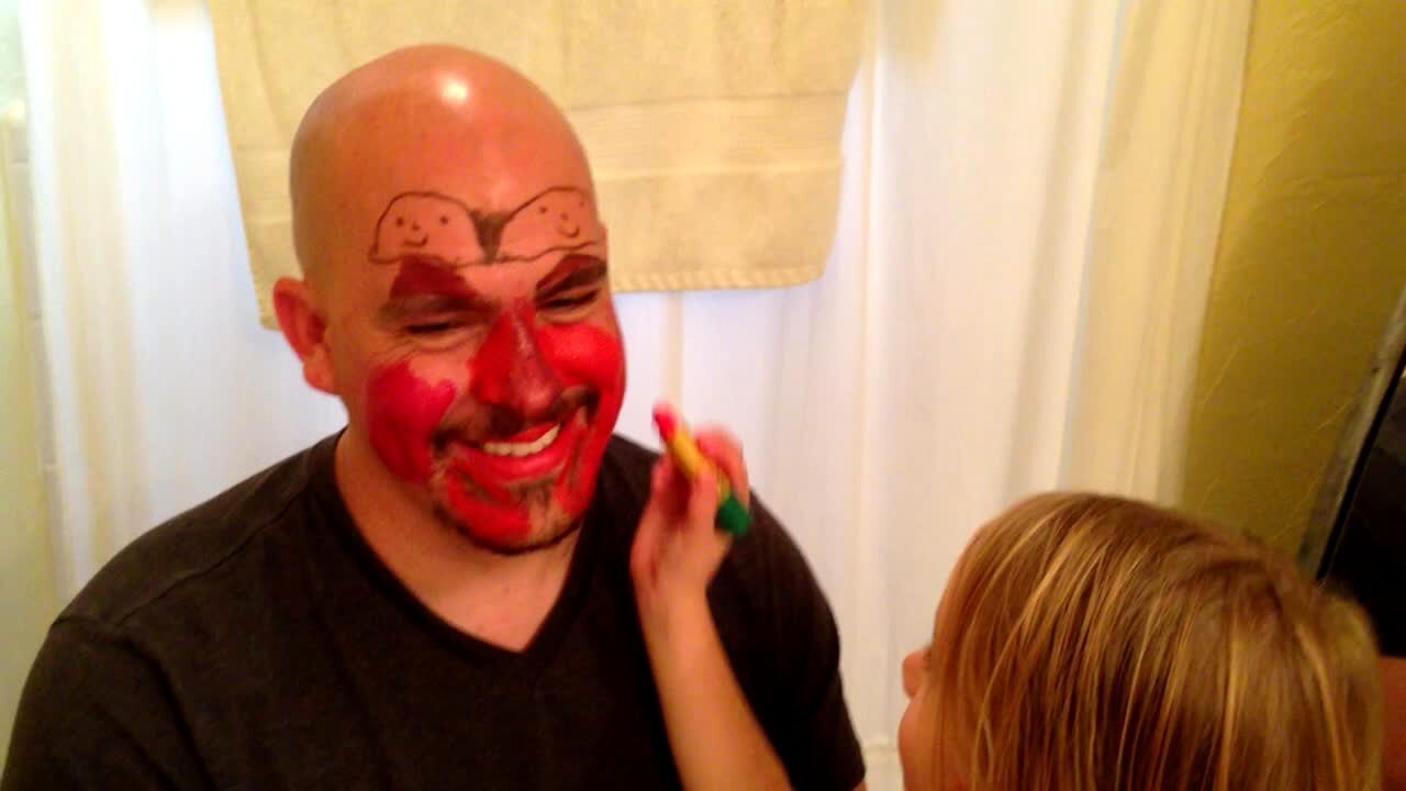 A bald man with a goatee struggles to open his eyes after his daughter put several different colors of make-up on his face.