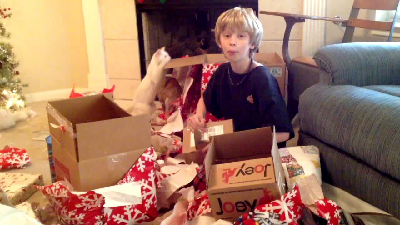 Two cats play in wrapping paper while a boy opens gifts at home. One cat jumps up to grab a box and the box tilts over onto the cat, trapping it.