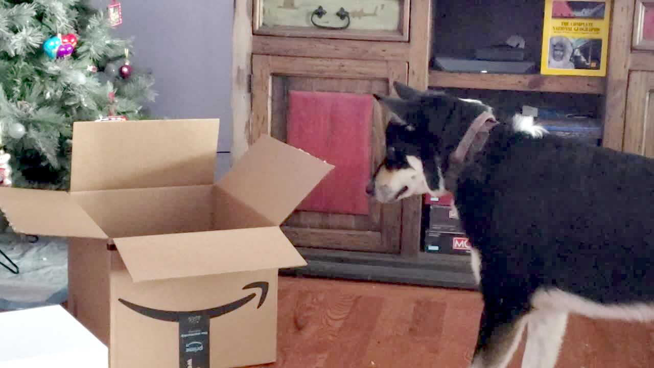 A woman opens a front door and a Yorkshire Terrier dog viciously scratches and bites a FedEx box on a doorstep.