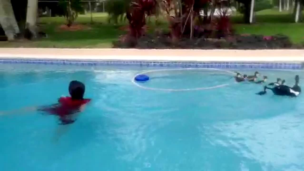 A young boy tries to push several ducklings out of a swimming pool outdoors and the mother duck attacks him.