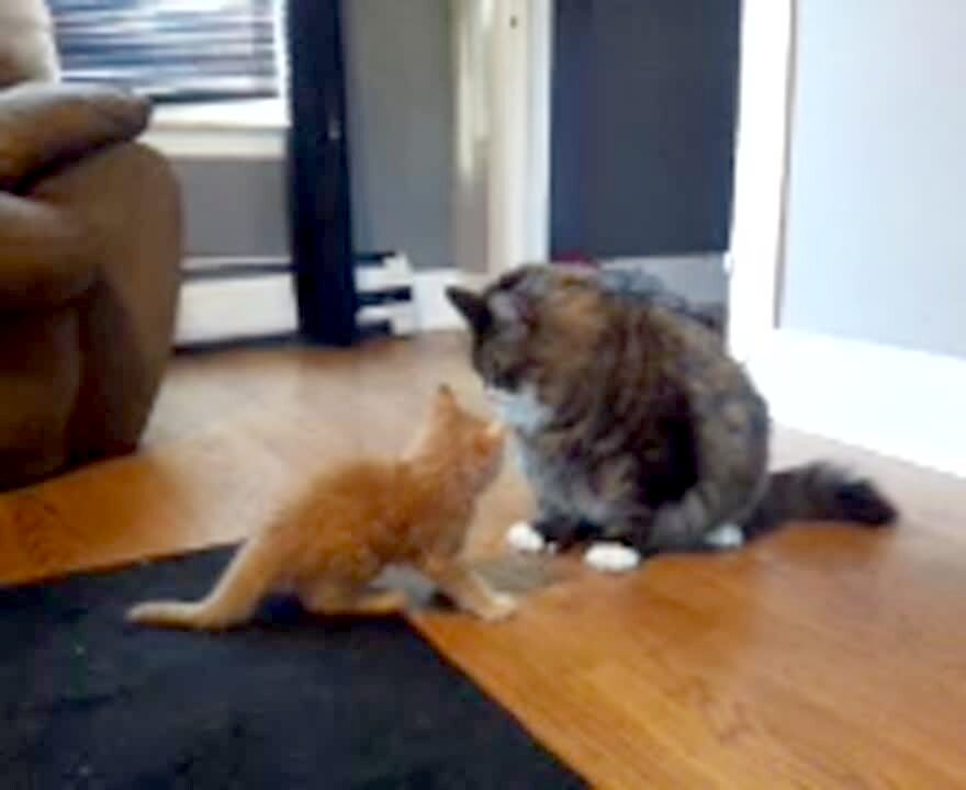A girl in a sleeping bag screams and hisses at a kitten cat that jumps on her face.