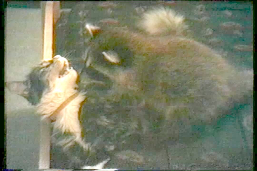 A baby girl tries to pet a cat, when the cat hisses at the baby a dog attacks the cat.