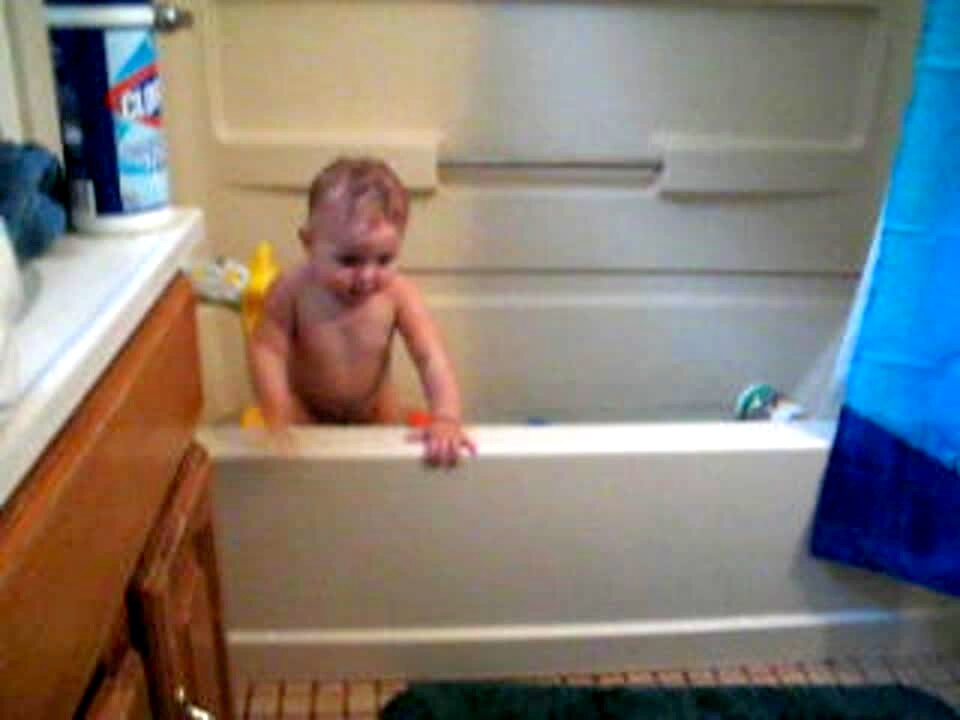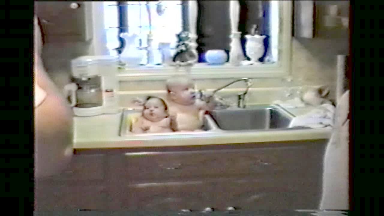 Squished baby bath: 2 babies bathe in a sink, very good visual.