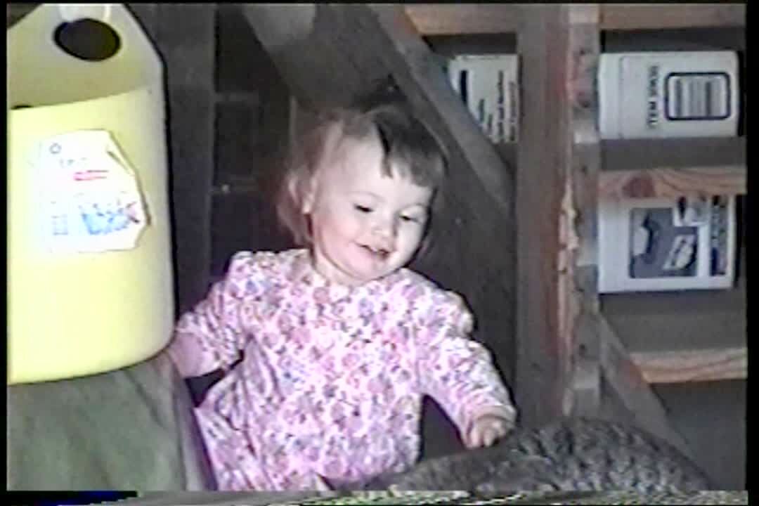 A baby girl raises her hand when her father says, "raise your hand if you made a poop."