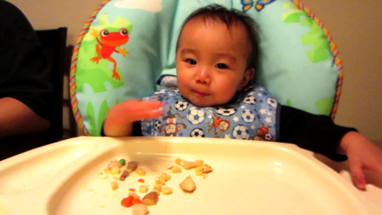 A baby boy in a highchair eats pieces of food rapidly one at a time by picking each one up and rushing it into his mouth. cereal