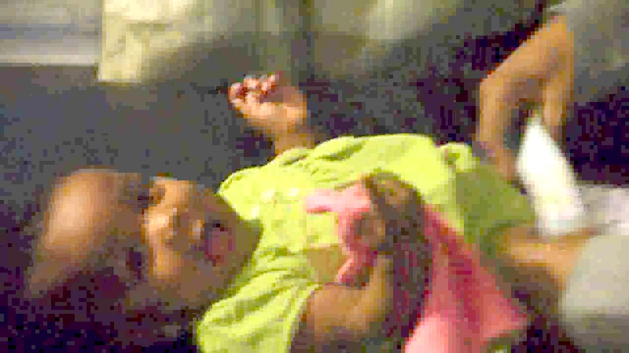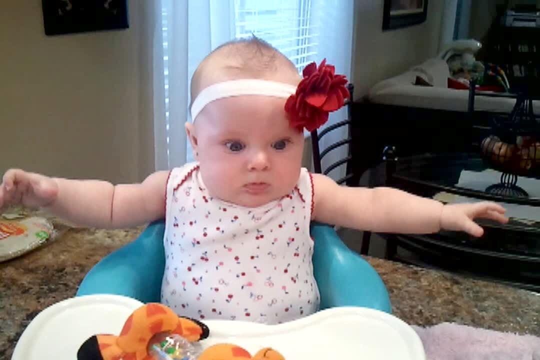 A tot baby girl is being fed. She is bouncing on bed and ends up bouncing into bowl of peaches and cream which gets dumped on her face. Great shot at 0:26 of her face covered.