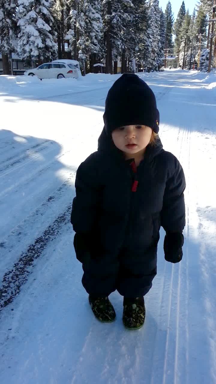 A baby boy walks down a road in snow, walks into a chihuahua while it poops, and steps in the poop.