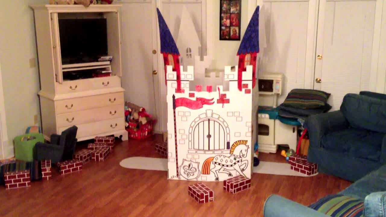 A cardboard castle slides around a room on the floor. At :22 you can see that a baby is pushing it around from inside.