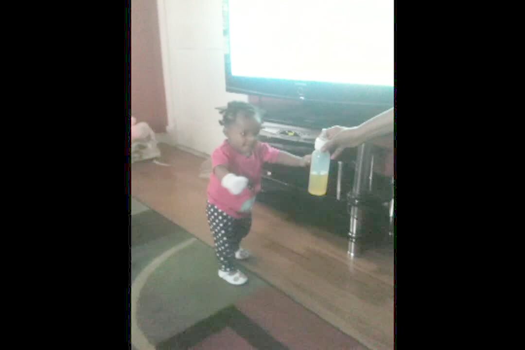 A baby girl taking her first steps to get a bottle is denied when a tot boy runs to grab it from her hands.