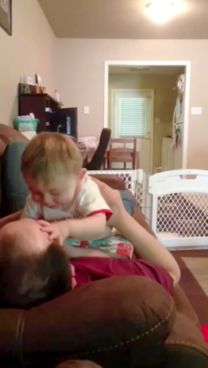 A baby boy hugs his dad then kicks him in the face on the couch.