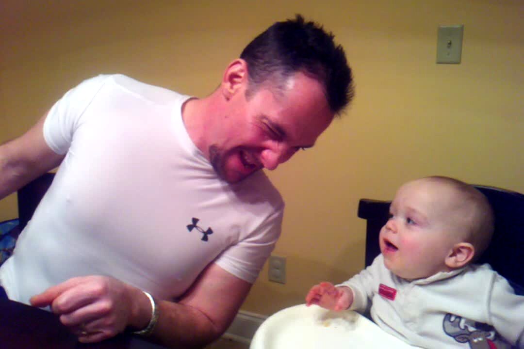 A man and a baby boy burp back and forth to each other while sitting at a table indoors.