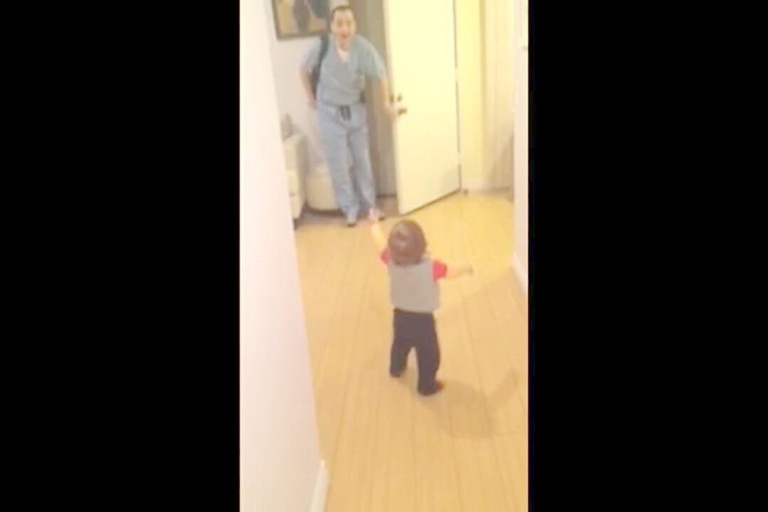 A baby boy smiles and holds his hands out for a hug while walking towards his dad but takes a sharp turn into the kitchen before reaching him.