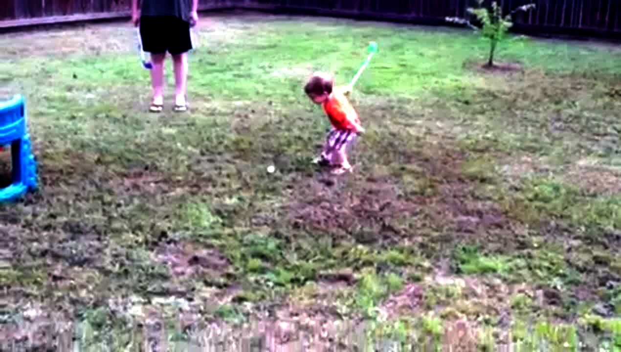 A tot two year old boy is in backyard trying to hit a toy golf ball with his toy club. He fails after many tries and gets fed up and throws both the club and the ball.