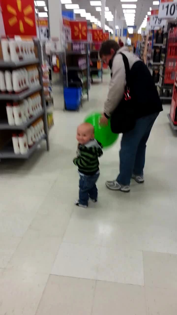 A man and a baby boy play with a big ball in a store. The baby falls into it and it pops at :31.