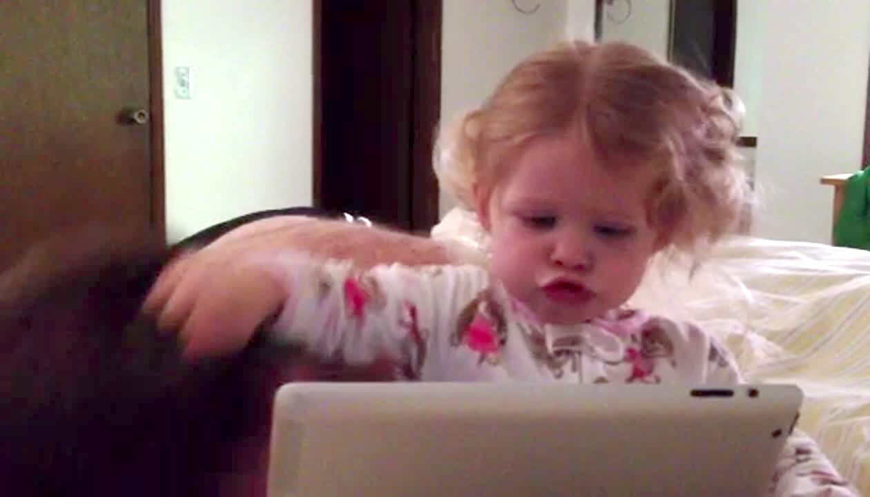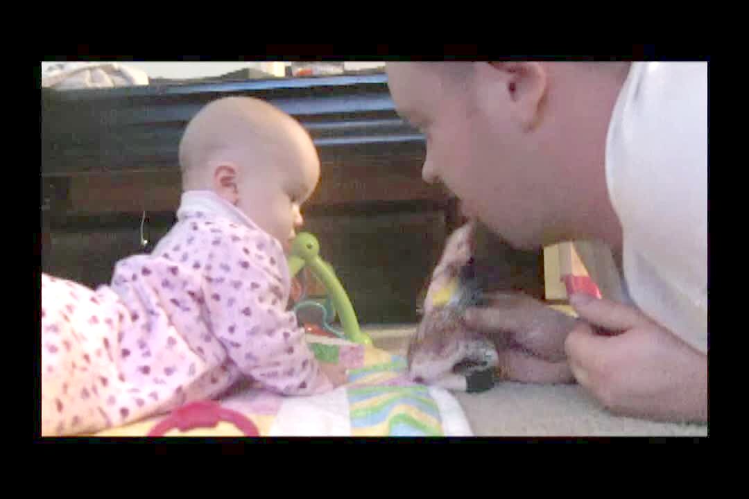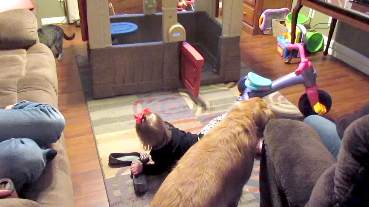 "Chow Down Crack Up" Baby girl in pink outfit has a great laugh while watching dog eat popcorn in foreground. Great framing.