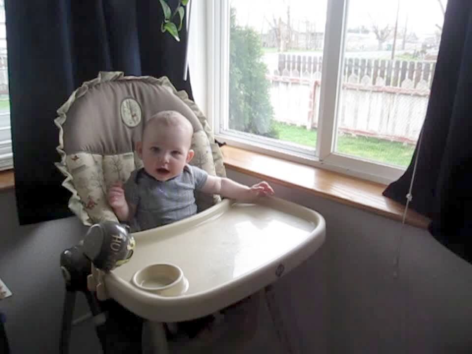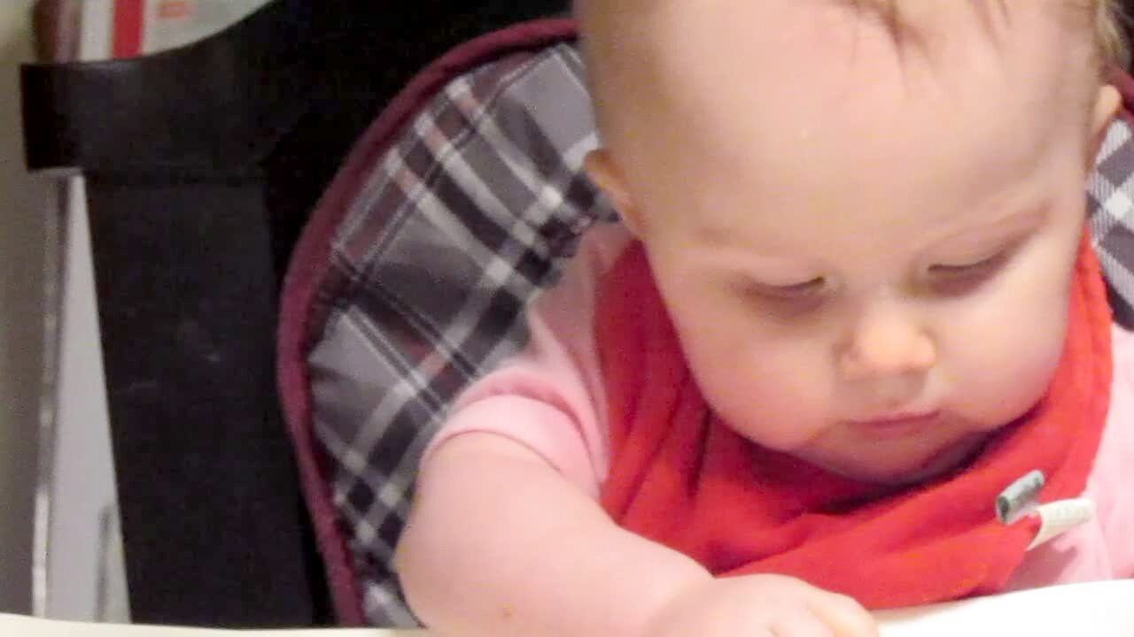 A baby girl in high chair lets out a burp at 0:18. She startles herself a little.
