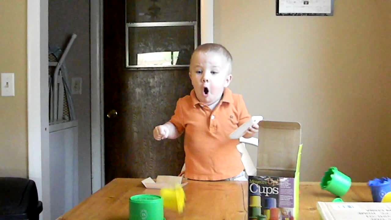 A tot boy is surprised when is sister knocks over a stack of cups right in front of him.