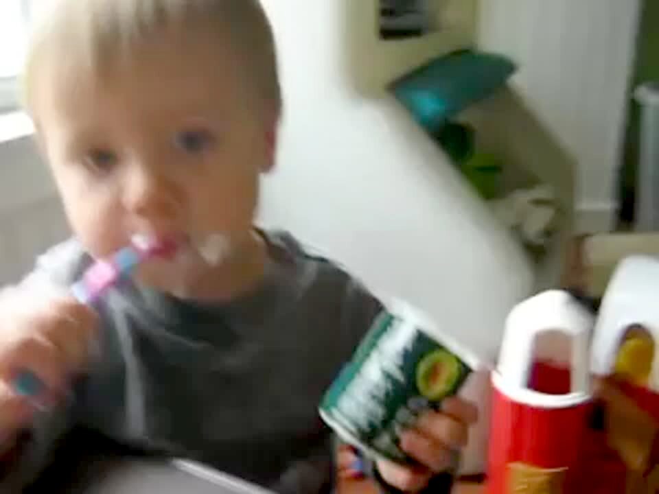 A tot baby boy is eating yogurt at table. He accidentally flings some of the yogurt onto his face at 0:21.