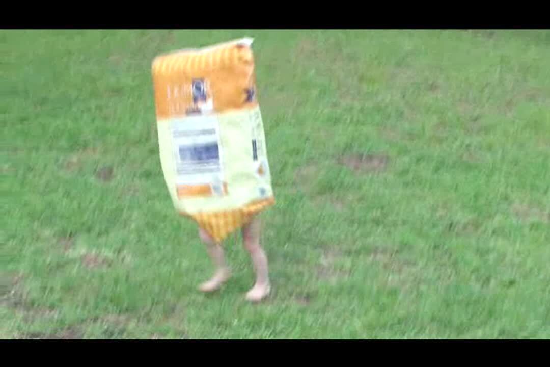 Tot girl walks around backyard with a feed sack over her head. She takes her diaper off and keeps walking around.