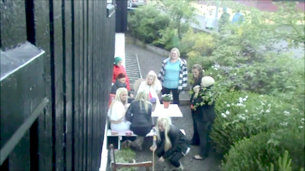 Several women sit at a picnic table for a back yard bachelorette party. One young woman lights a large bottle rocket firework. It flies into the air, bounces off the edge of the roof, falls back down to the ground, and explodes, sending sparks everywhere. The women run away just before it explodes. Subtitle text over the footage.