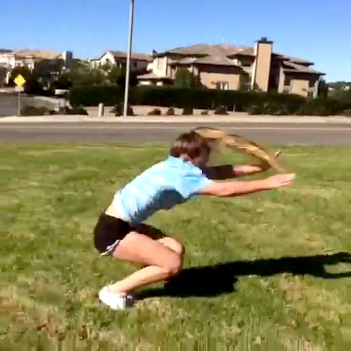 A teen girl does a series of back flips outdoors before she crashes into plants as her friend behind the camera yells "Plants!" Vine/Instagram.