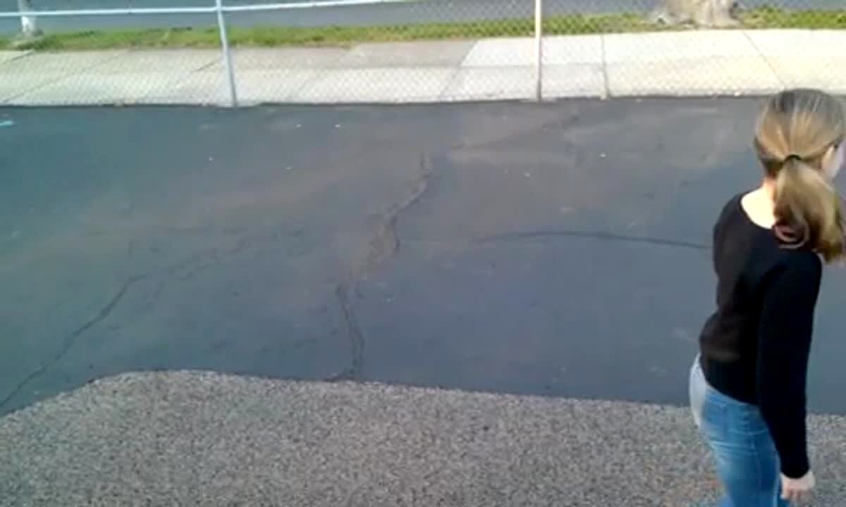 A girl tries a back flip and lands on awkwardly on pavement. No tail.