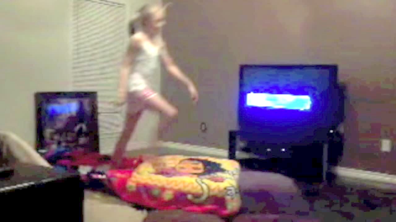 Girls do back flips on a small mattress indoors, practicing gymnastics. One girl tries a front flip and the blanket underneath her gets whipped over her face. The woman behind the camera laughs.