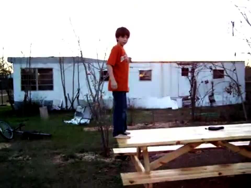 Young boy does back flip off a wooden picnic table in backyard. He hits his head on the table on his way down. He holds his head in his hands.