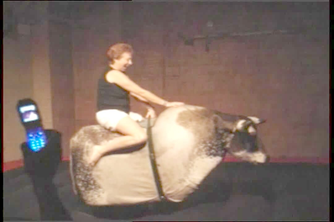 Drunk woman falls of a mechanical bull & flips backwards.