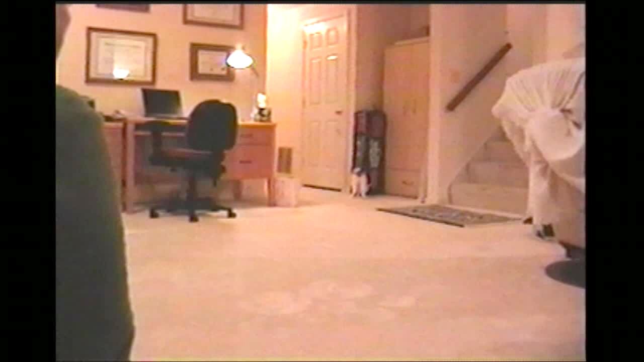 Woman throws a piece of paper. Cat jumps, does back flip, lands, and catches the ball. Pet trick.