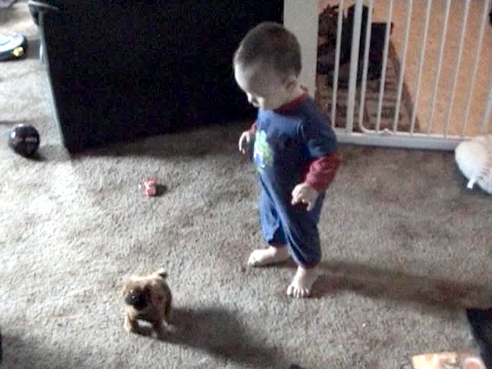 Baby boy stumbles backwards and falls on the floor when a battery operated dog toy does a backflip.
